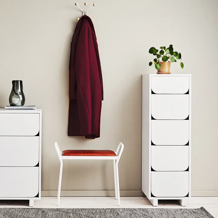 Στενόμακρη σιφονιέρα, Vidja: Η σιφονιέρα Vidja smal με 5 συρτάρια από 1898 είναι μέρος της συλλογής Vidja που δημιουργήθηκε από την Eva Lilja Löwenhielm. Εμπνευσμένη από το ευλύγιστο φύλλο vidja, αυτή η σιφονιέρα διαθέτει συρτάρια με μαλακό κλείσιμο και κομψά μπροστινά πάνελ σε βαμμένη MDF καθώς και ματ βαμμένο κόντρα-πλακέ σημύδας στο εσωτερικό. Η κασέτα, επίσης από βαμμένη MDF με ακριβώς κομμένες γωνίες, προσφέρει αίσθηση στιβαρότητας. Για επιπλέον άνεση περιλαμβάνονται βίδα προσάρτησης στον τοίχο και αυτοκόλλητα πέλματα από τσόχα. Ένα τέλειο έπιπλο για κομψή αποθήκευση.