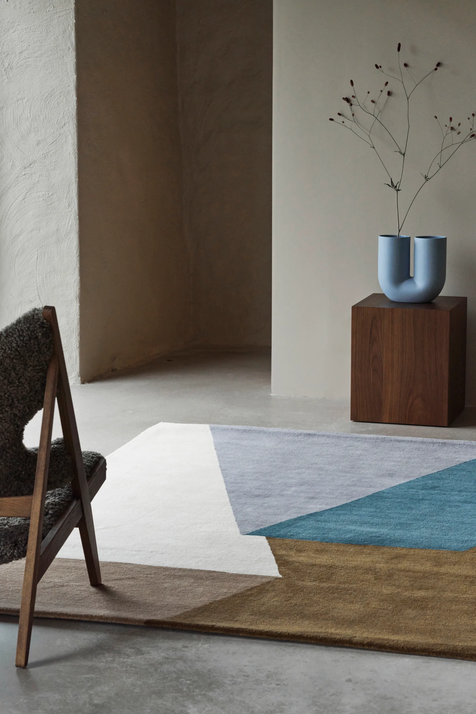 Μαλλί από πρόβατο με σπιράλ ρίζα σε σκούρο καφέ χρώμα, πόδια από σκούρα βαμμένη βελανιδιά.