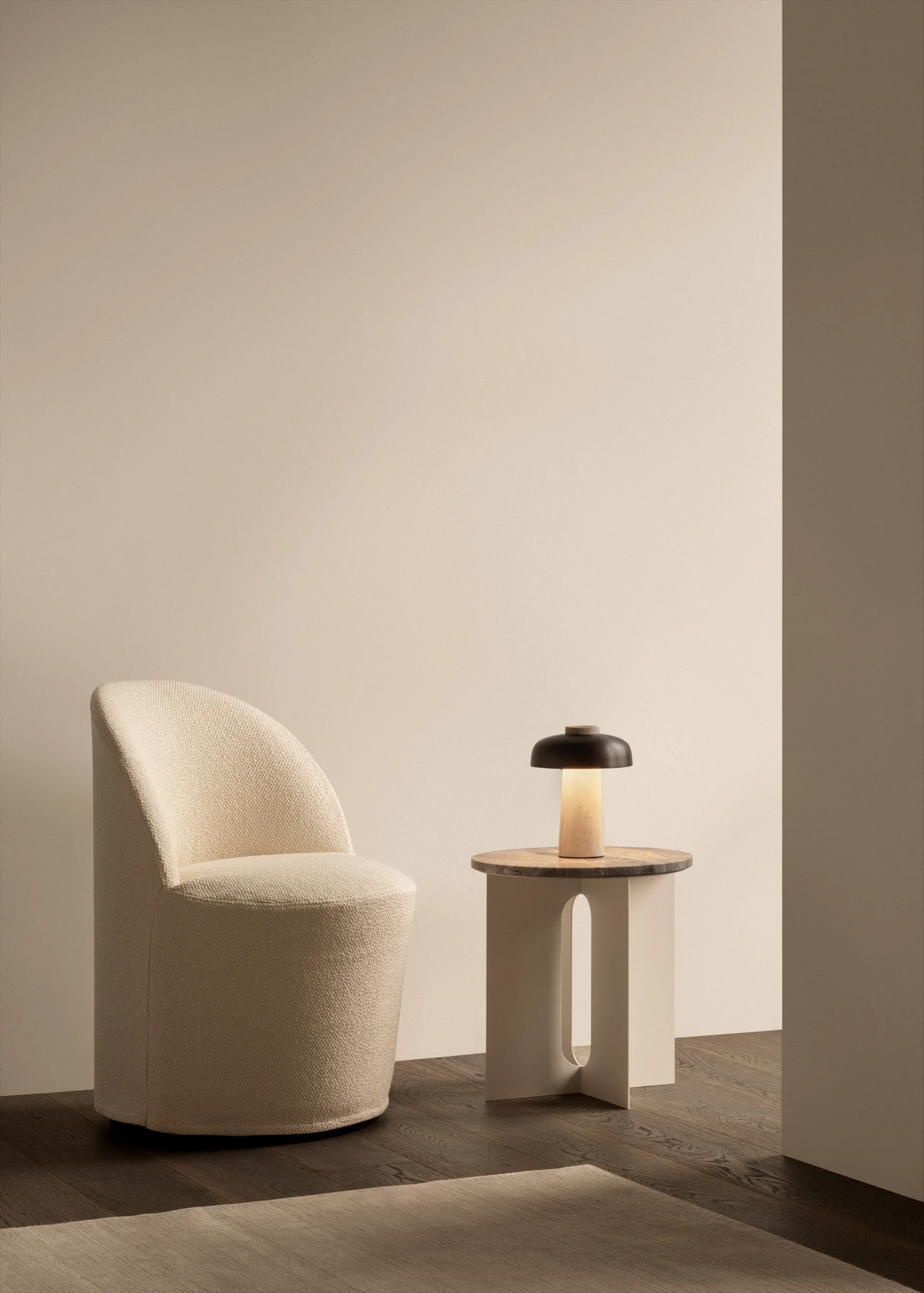 Η φορητή επιτραπέζια λάμπα Reverse 24,5 cm από την Audo Copenhagen συνδυάζει αρμονικά ακατέργαστα και εκλεπτυσμένα υλικά. Η κωνική βάση από ακατέργαστη πέτρα διαθέτει φυσικές διαφοροποιήσεις που αναδεικνύουν την οργανική της ομορφιά, ενώ το καμπυλωτό καπέλο από μπρούντζο αλουμινίου δημιουργεί μια κομψή αντίθεση. Ένας οπαλίνος διαχυτής εκπέμπει ένα απαλό και ομοιόμορφο φως, ιδανικό για τη δημιουργία μιας ζεστής ατμόσφαιρας. Με τρία επίπεδα ρύθμισης φωτεινότητας, η λάμπα προσαρμόζεται σε διάφορες ανάγκες, καθιστώντας την ιδανική τόσο για το τραπεζάκι του σαλονιού όσο και για εξωτερικούς χώρους. Μια φορητή λάμπα που θα πρέπει να αποθηκεύεται σε εσωτερικό χώρο όταν δεν χρησιμοποιείται, ώστε να διατηρηθεί για περισσότερο καιρό.