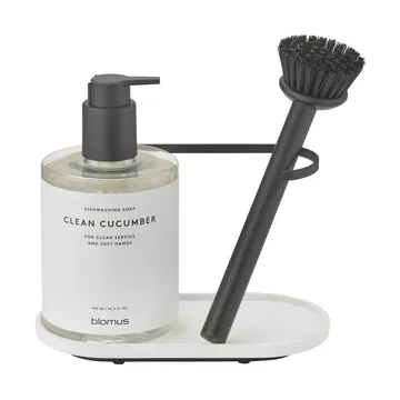 Η Dhuva θήκη για βούρτσα πιάτων και σαπούνι από την blomus συνδυάζει υλικά όπως το σκυρόδεμα, το ανοξείδωτο ατσάλι και η σιλικόνη για μια ανθεκτική και κομψή λύση κουζίνας. Η βάση από σκυρόδεμα με στεγανοποίηση PU προστατεύει την επιφάνεια, ενώ το επικαλυμμένο με πούδρα πλαίσιο κρατά πανιά πιάτων. Το συνοδευτικό σετ βούρτσας ARJA διαθέτει ένα αντικαταστάσιμο πλαστικό κεφάλι για εύκολο καθαρισμό.