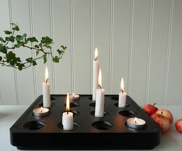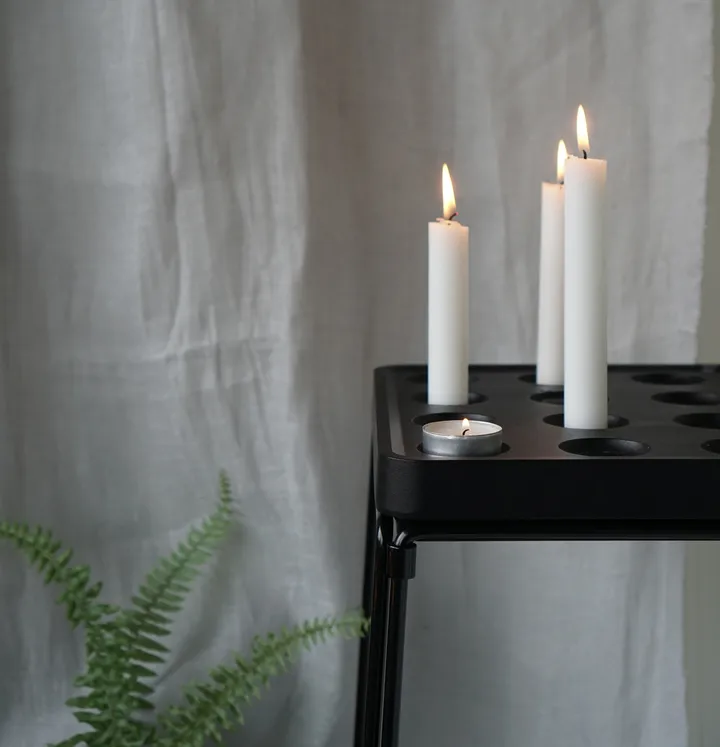 Stumpastaken βάση κεριού μαύρο από Born In Sweden είναι ένα διαχρονικό και πρακτικό κηροστάσιο σχεδιασμένο από τον Jonas Torstensson. Με θέση για είτε δεκαέξι είτε εννέα κεριά προσφέρει ένα ζεστό, φιλόξενο φως και αξιοποιεί κάθε υπολειπόμενο κηρόσπαρο, tealight ή block candle — χωρίς να τρέχει το κερί και να καταστρέφει το τραπέζι. Ο λιτός, λειτουργικός σχεδιασμός το καθιστά εύκολο να τοποθετηθεί στο τραπεζάκι φαγητού, στο sideboard ή στο παράθυρο ως ένα όμορφο φωτεινό σημείο στο σπίτι. Εύκολο στον καθαρισμό στο φούρνο σύμφωνα με τις οδηγίες για να διατηρήσει την όμορφη εμφάνισή του για πολύ καιρό.