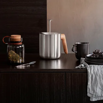 Η Nordic Kitchen πρέσα τσαγιού από την Eva Solo παρασκευάζει το τσάι σας ακριβώς τόσο δυνατό όσο το θέλετε εσείς και οι καλεσμένοι σας, χάρη στο μοναδικό σύστημα εξαερισμού. Όταν το τσάι έχει φτάσει την επιθυμητή δύναμη, πιέζετε το έμβολο, το οποίο με τη σειρά του παγιδεύει τα φύλλα τσαγιού στον πάτο και τα διαχωρίζει από το νερό. Με αυτόν τον τρόπο είναι εύκολο να ρυθμίσετε την επιθυμητή ένταση του τσαγιού. Η πρέσα τσαγιού είναι κατασκευασμένη από κομψό ανοξείδωτο ατσάλι με όμορφη λαβή από λαδωμένη δρυ και διαθέτει διπλά τοιχώματα, ώστε να διατηρεί το τσάι ζεστό για μεγάλο χρονικό διάστημα.