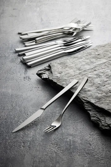 Το σετ Fuga μαχαιροπίρουνα για γκριλ 12 τεμάχια από τη σουηδική Gense είναι ένα σετ μαχαιροπίρουνων με έξι πιρούνια γκριλ και έξι μαχαίρια γκριλ από ανοξείδωτο χάλυβα υψηλής ποιότητας σχεδιασμένα από τον Tias Eckhoff. Τα μαχαιροπίρουνα κάθονται καλά στο χέρι και έχουν ένα σχέδιο με απαλά στρογγυλεμένες γραμμές. Συνδυάστε τα μαχαιροπίρουνα για γκριλ με τα υπόλοιπα κομμάτια της σειράς Fuga για μια ομοιόμορφη τοποθέτηση τόσο στην καθημερινότητα όσο και στις γιορτές.