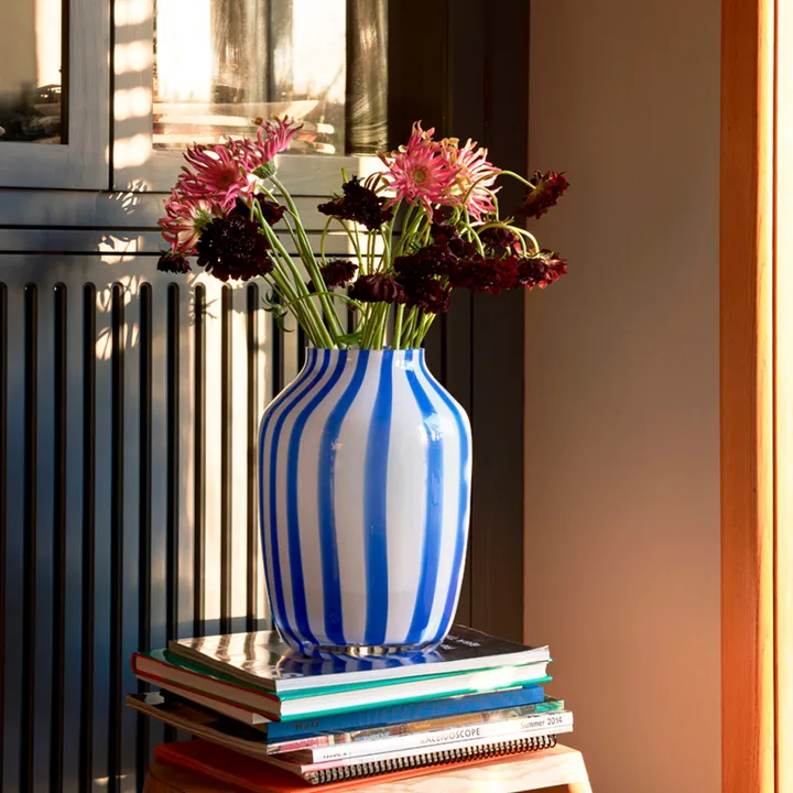 Βάζο Juice από HAY. Σχεδιασμένο από την Kristine Five Melvær, αυτό το γυάλινο βάζο έχει κάθετες γραμμές που προσφέρουν μια διακριτική χρωματική διαβάθμιση. Ιδανικό για την τοποθέτηση λουλουδιών και για να προσθέσει μια πινελιά κομψότητας στο σπίτι.