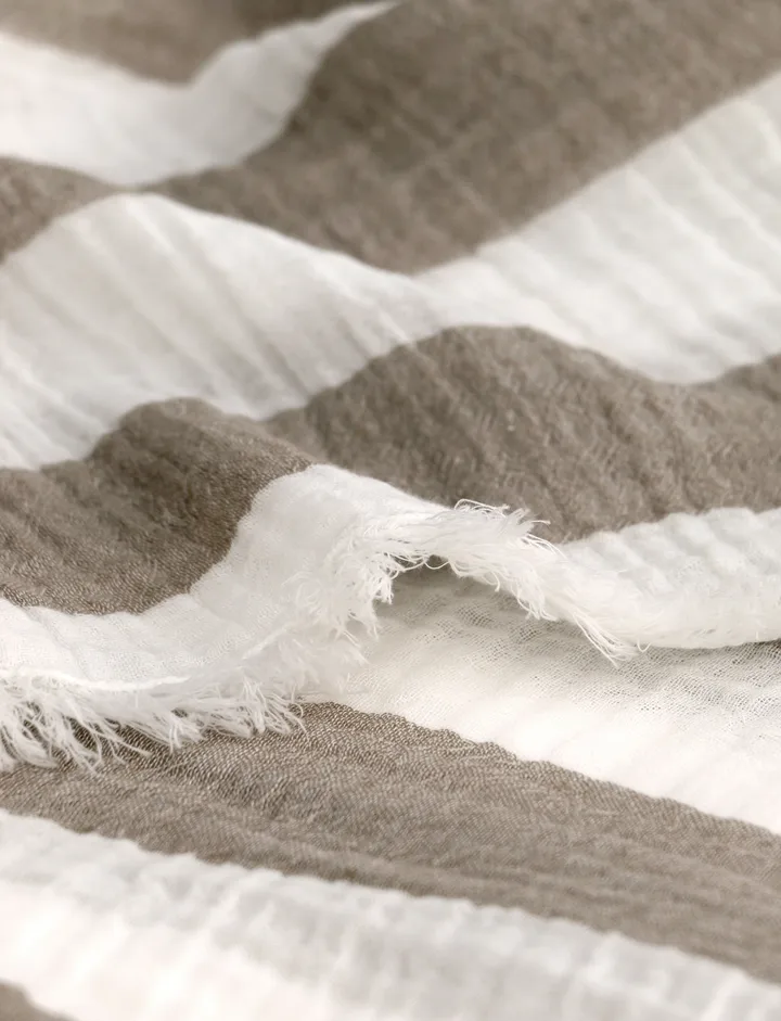 Antibes κουβέρτα 130x170 cm από Himla είναι φτιαγμένη από λεπτό μουσελίνο 100% βαμβακιού, καθιστώντας την ταυτόχρονα μαλακή και αέρινη. Ο σχεδιασμός με μπλοκ ρίγες και φουντίτσες δημιουργεί μια κομψή λεπτομέρεια που λειτουργεί εξίσου καλά ως κουβέρτα μέσα στο σπίτι και ως δροσερή σοάλ ή σαρόνγκ για ζεστές μέρες.