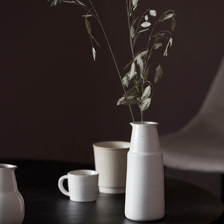 Pion καράφα 18 cm από την House Doctor είναι μια όμορφη καράφα με αρμονικό σχήμα που προσδίδει στη στρωμένη τραπεζαρία μια ζεστή και φιλόξενη αίσθηση. Ο σχεδιασμός της σειράς Pion διαθέτει λευκή γλάσο με μικρές τελίτσες που δημιουργούν ένα διακριτικό μοτίβο και δίνουν σε κάθε κομμάτι τη δική του έκφραση. Ιδανική για σερβίρισμα σιροπιού, χυμού ή ντρέσινγκ στο πρωινό ή σε ένα χαλαρό δείπνο με φίλους. Συνδυάστε την με πιάτα και μπολ από τη σειρά Pion για ένα ενοποιημένο και προσωπικό σετάρισμα τραπεζιού. Οι παραλλαγές στη γλάσο κάνουν κάθε καράφα μοναδική.
