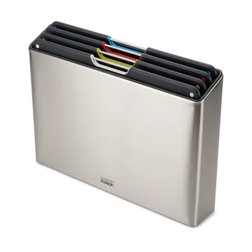 Folio steel ξύλο κοπής 4 τεμαχίων από Joseph Joseph προσφέρει μια κομψή βάση με τέσσερις μεγάλες ξύλινες επιφάνειες κοπής σε διαφορετικά χρώματα. Κάθε επιφάνεια έχει υφή και αντιολισθητικά πόδια. Με τον έξυπνο κεκλιμένο σχεδιασμό και τις ανοξείδωτες ράβδους είναι εύκολη η αφαίρεσή τους από τη βάση. Η βάση διαχωρίζει επίσης τις επιφάνειες ώστε να κυκλοφορεί αέρας.