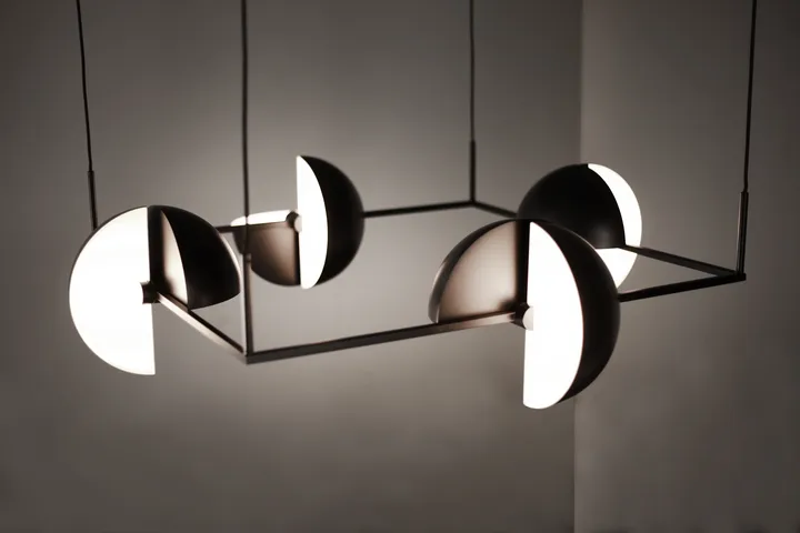 Το Κρεμαστό φωτιστικό Trapeze quartet, 113,5 x 113,5 εκ. είναι μια εντυπωσιακή πηγή φωτός κατασκευασμένη από αλουμίνιο και ακρυλικό. Αυτή η κατασκευή αποτελείται από τέσσερα εκκρεμή και τέσσερις γωνιακές συνδέσεις σε μαύρο χρώμα. Σχεδιασμένο από την Jette Scheib για την μάρκα Oblure.