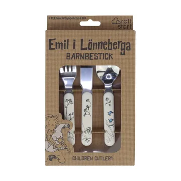 Τα Μαχαιροπίρουνα για παιδιά Emil i Lönneberga 3 τεμαχίων από την Rätt Start είναι κατασκευασμένα από πλαστικό ABS και ανοξείδωτο ατσάλι. Αυτά τα ανθεκτικά μαχαιροπίρουνα με σχέδια από την Ilon Wikland ταιριάζουν τέλεια για μικρά χέρια και στόματα. Το σετ περιλαμβάνει μαχαίρι, πιρούνι και κουτάλι και παραδίδεται σε πρακτικό κουτί δώρου.
