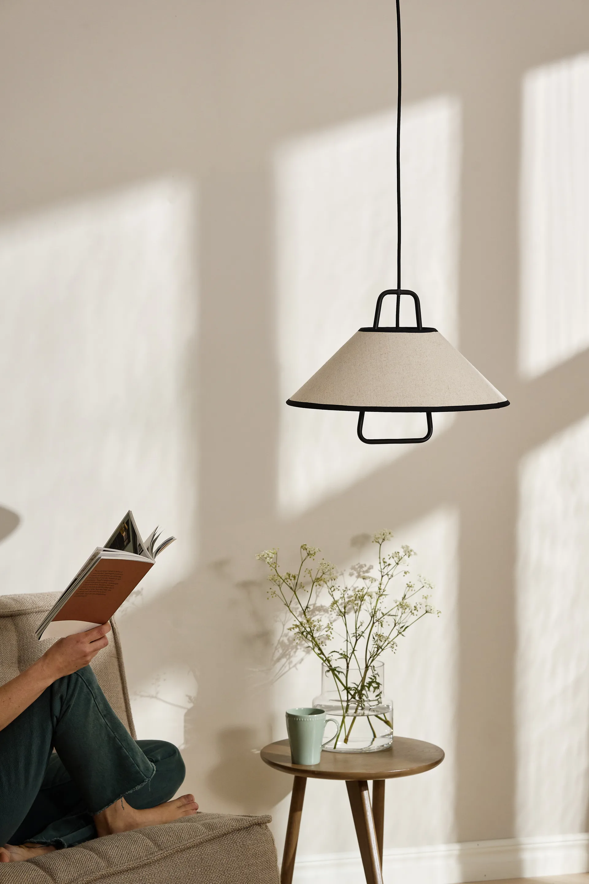 Φωτιστικό οροφής Moss Ø42 εκ. έχει μεταλλική βάση που στηρίζει ένα λινό καπέλο με ραμμένες άκρες. Το σχήμα είναι εμπνευσμένο από ρετρό στυλ σε αρμονικό συνδυασμό με ιαπαντί έκφραση και απλότητα σε αντιθέσεις. Το φωτιστικό διαχέει ένα ζεστό, ευχάριστο φως που δημιουργεί μία φιλόξενη ατμόσφαιρα. Ιδανικό πάνω από το τραπέζι φαγητού, στο σαλόνι ή στο υπνοδωμάτιο, όπου λειτουργεί τόσο ως ατμοσφαιρικός φωτισμός όσο και ως κομψό διακοσμητικό στοιχείο.
