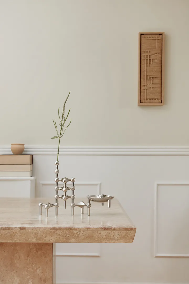 STOFF Nagel βάση κεριού συσκευασία 3 τεμαχίων από STOFF Copenhagen είναι ένα εμβληματικό κομμάτι του σύγχρονου design, με γλυπτική φόρμα και ανεξάντλητες δυνατότητες συνδυασμών. Οι Werner Stoff και Hans Nagel δημιούργησαν το αρχικό μοντέλο τη δεκαετία του 1960, μια συνεργασία που καθόρισε ολόκληρη μια εποχή της δανικής σχεδίασης. Η αρθρωτή κατασκευή των κηροπηγίων επιτρέπει τη δημιουργία προσωπικών συνθέσεων ή την τοποθέτηση κάθε μέρους ως αυτόνομου αντικειμένου. Το ανακλαστικό μέταλλο αιχμαλωτίζει το φως με όμορφο τρόπο και δημιουργεί μια κομψή ατμόσφαιρα στον χώρο. Το STOFF Nagel βάση κεριού συσκευασία 3 τεμαχίων από STOFF Copenhagen είναι ένα διαχρονικό εμβληματικό σχέδιο που ενώνει ιστορία, δεξιοτεχνία και δημιουργική ελευθερία.