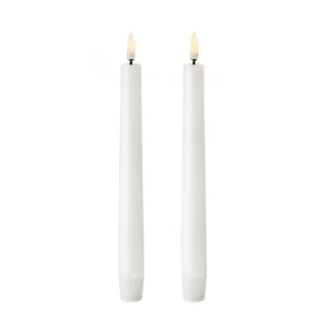 Τα Uyuni LED λιανοκέρια λευκά Συσκευασία 2 τεμαχίων από τη δανική Uyuni Lighting έχουν όλα τα ωραία χαρακτηριστικά των κανονικών κεριών - αλλά με πιο ασφαλή και πιο μακροχρόνια χρήση. Η ελαφρώς τρεμοπαίξιμο και κατοχυρωμένη με πατέντα 3D φλόγα σε συνδυασμό με την επιφάνεια παραφίνης κάνουν τα LED-κεριά ρεαλιστικά και προσδίδουν την ίδια απαλή και φιλόξενη αίσθηση στο δωμάτιο όπως τα αναμμένα κεριά. Συνδυάστε τα λιανοκέρια με το τηλεχειριστήριο της Uyuni για να χρησιμοποιήσετε τη λειτουργία ρύθμισης φωτεινότητας και να ρυθμίσετε το χρονόμετρο για 4, 6, 8 ή 10 ώρες αντί για το ενσωματωμένο χρονόμετρο των 6 ωρών των κεριών.